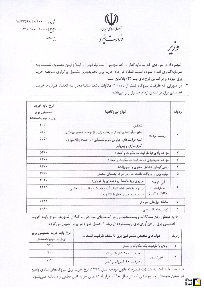 چهارشنبه 28 خرداد 1399 بازدید : 757 تعداد نظرات : 0 عنوان حجم دانلود دانلود نرخ خرید تضمینی نیروگاههای خورشیدی سال98 1409 مگابایت دانلود دانلود نرخ خرید تضمینی نیروگاهها سال98 به منظور حداکثرسازی ضریب تحقق مزایای تولید برق از منابع تجدیدپذیر و نیز افزایش رقابت پذیری در زنجیره صنعت برق تجدیدپذیر، افزایش تعرفههای خرید تضمینی برق از سوی وزیر محترم نیرو طبق فایل پیوست اعلان و ابلاغ گردید. اشتراک گذاری در :